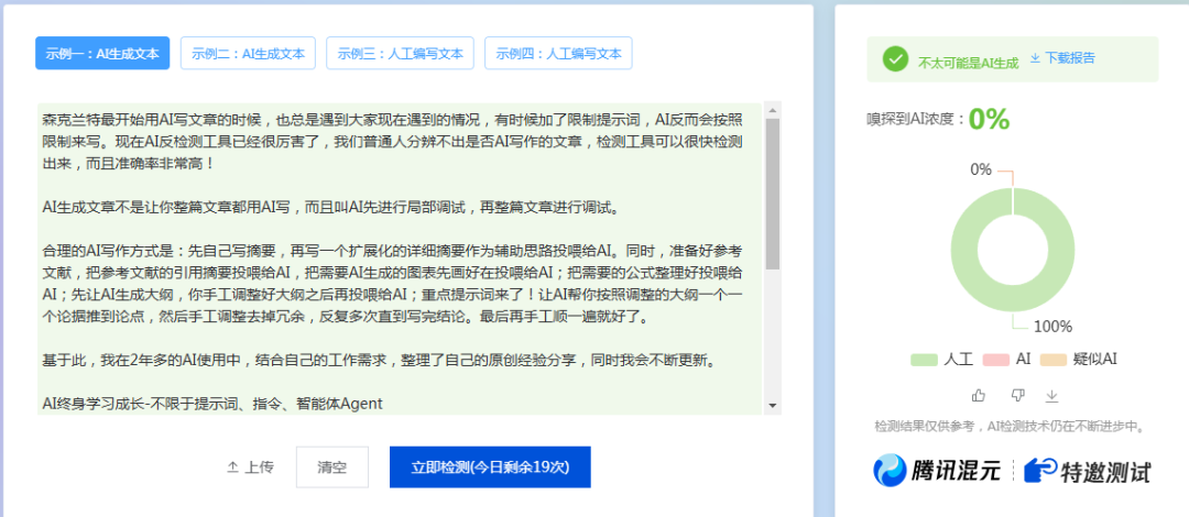森克兰特最开始用AI写文章的时候,也总是遇到大家现在遇到的情况,有时候加了限制提示词,AI反而会按照限制来写。现在AI反检测工具已经很厉害了,我们普通人分辨不出是否AI写作的文章,检测工具可以很快检测出来,而且准确率非常高!