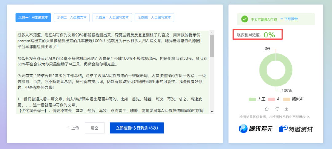 今天森克兰特结合我2年多的工作总结,总结了去掉AI写作痕迹的一些提示词,大家按照我的方法一边写,一边去检测。当然,你不断复盘总结,研究新的提示词,仍然有希望接近0%被检测出来的可能性。我是很看好你的,但是你得努力哦!