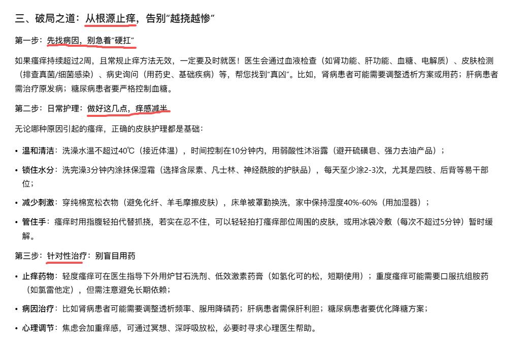 这位朋友的问题是很有代表性的。我来分析他的提示词:“你是一位资深的科普专家,请以题目《“痒”不欲生的背后:透析皮肤瘙痒的“破局”之道》面向患者撰写一篇科普文。要求:前言部分简洁明了,引入痛点。整篇文章内容通俗易懂,避免用专业术语,文章层次清楚,逻辑性强,前后呼应,避免重复,字数在2000左右。”