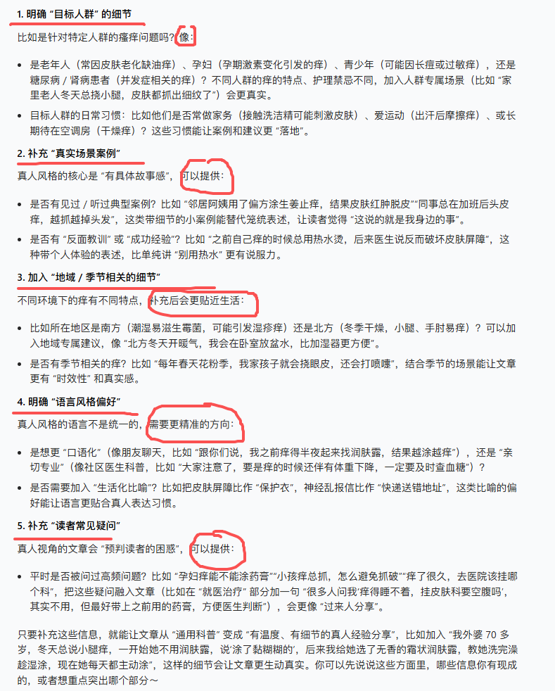 由于篇幅有限,我省略直接用AI生成的内容(没法看!)。直接反问AI:我想在想写《“痒”不欲生的背后:透析皮肤瘙痒的“破局”之道》这样一篇文章,请问我还需要提供哪些内容,才能让你写出与真人写作一样的文章?