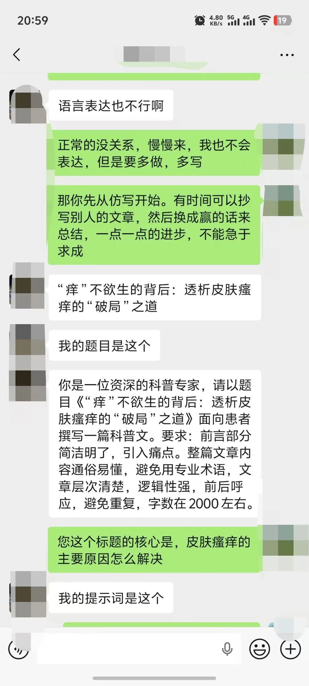 这位朋友的问题是很有代表性的。我来分析他的提示词:“你是一位资深的科普专家,请以题目《“痒”不欲生的背后:透析皮肤瘙痒的“破局”之道》面向患者撰写一篇科普文。要求:前言部分简洁明了,引入痛点。整篇文章内容通俗易懂,避免用专业术语,文章层次清楚,逻辑性强,前后呼应,避免重复,字数在2000左右。”