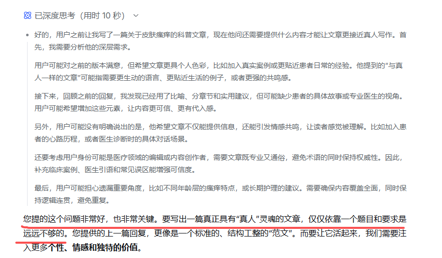 我们来分析他的标题:《“痒”不欲生的背后:透析皮肤瘙痒的“破局”之道》,这个标题本身就很抽象!我前一篇文章已经告诉大家了:目前AI仍然是推理结合思考模型,推理仍然是第一步!你直接投喂抽象的标题,没有其它实质性的内容,让AI去推理写作,写出来的肯定是很“无厘头”的!