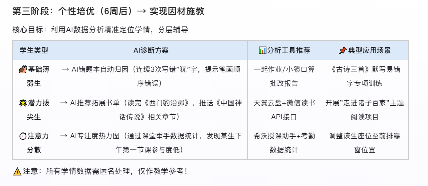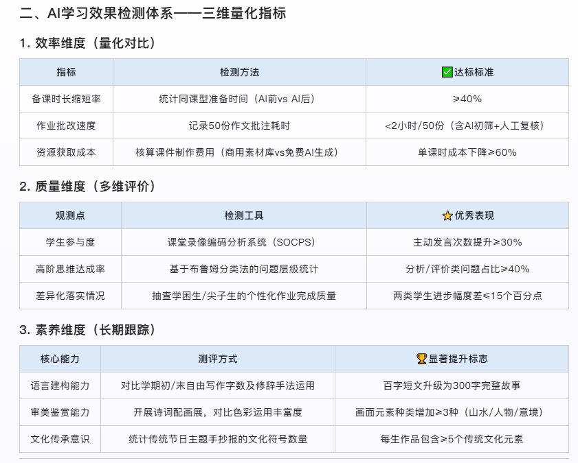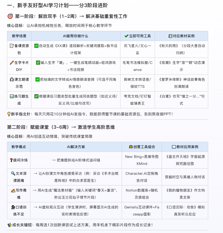 举例,我的提示词:你好,我是一名小学语文老师,我是AI新手小白,请问怎样将AI用于我的教学中?请结合小学语文教材,以及小学语文教育的特点,列出一个清晰的AI学习计划,以及怎样检测我的AI学习效果?