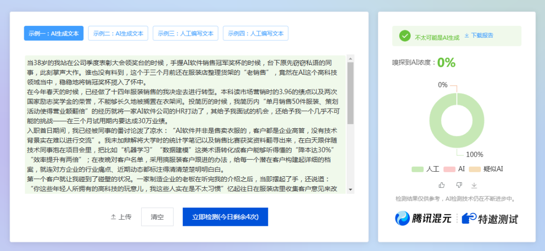 森克兰特推荐专业降AI率网站:https://paper.ai-or.com,通过我上千次的测评(我每天用AI写大量文章和小说,然后用这个网站来降低AI率),一次就能把朱雀的AI率从100%降低到0%。