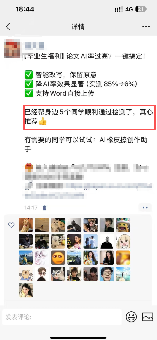 这个网站是我为数不多真心推荐的!关键是它能以这么低的价格解决问题。是非常非常难找的。其他降低AI率的网站价格至少是它的几倍,甚至上百倍。在我看来,能快速花小钱解决大事情,就是爽!