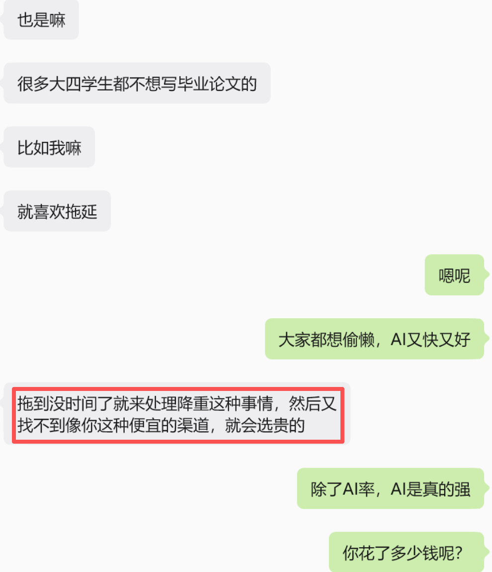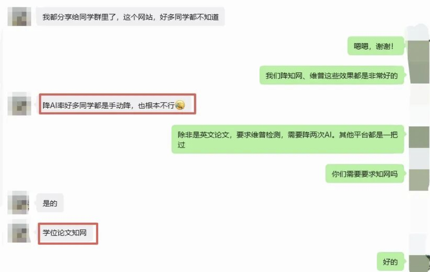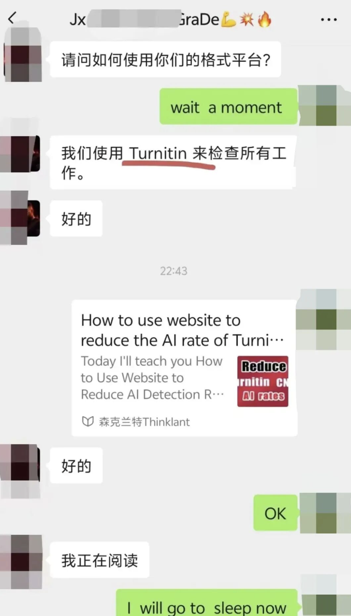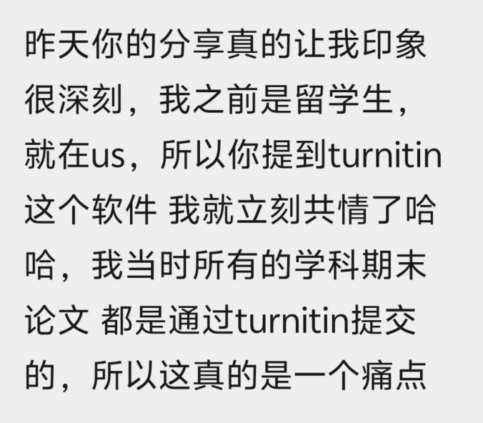 这些都是真真实实的评价。同时让我吃惊的是,居然还有不少外国留学生找到我,原因是一位留学生用了我们网站处理AI,顺利通过了Turnitin的检测。后面他就介绍了给他的同学们。