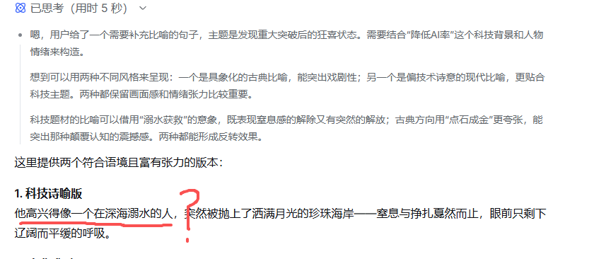 他高兴得像一个在深海溺水的人???It's crazy! 这就是高困惑度,把AI都难到了,只能胡言乱语了!森克兰特发现,AI在用写形容词,用比喻句,写场景的时候,基本上都会“胡扯”!99%都会出现上面的“低级错误”!怎么调教它都无济于事!所以我直接会在提示词里面写上:去掉所有的形容词和比喻句,除非你很有把握否则请谨慎使用场景描写。
