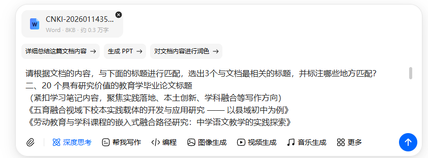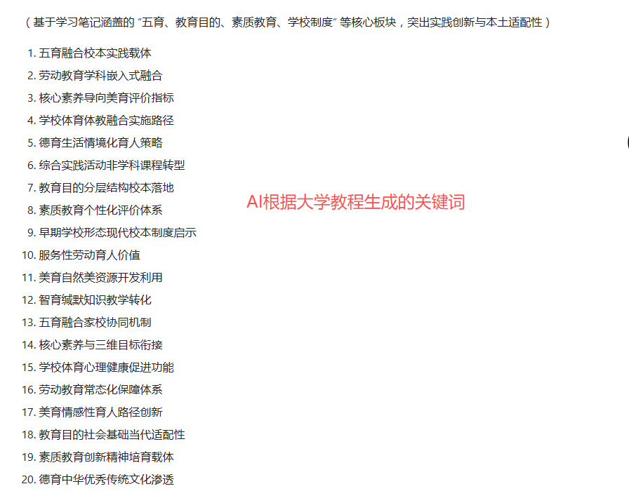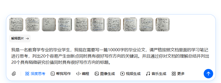2、把我们整理好的大学学习笔记发给AI,用下面的提示词:我是一名**专业的毕业学生,我现在需要写一篇10000字的毕业论文,请严格按照文档里面的学习笔记进行思考,列出20个容易产生创新点同时具有很好写作方向的关键词。并且通过你对文档的理解总结并列出20个具有稍微研究价值同时具有很好写作方向的标题。