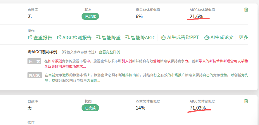 把论文导出为word文档,检查AI率。两个平台都显示:AI率超高!