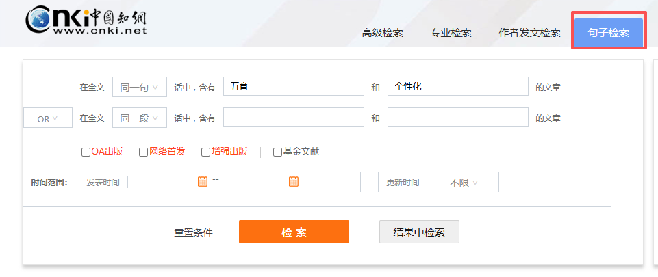 3、在 “知网” 平台点击 “句子检索”,输入上面你认为比较容易写作的关键词,进行检索。