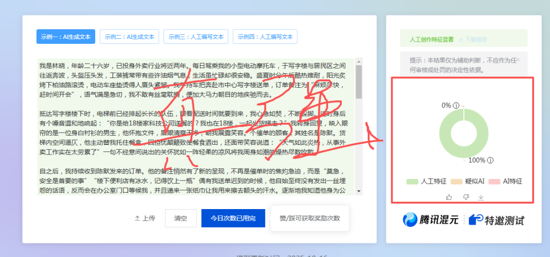 我们用AI写的自媒体文章或者Paper,类似腾讯朱雀、知网、Turnitin等AIGC率平台会很容易检测出来,而且算法更新很快,如果你能把AIGC率从100%降低到<10%,那你已经击败了99%的人。