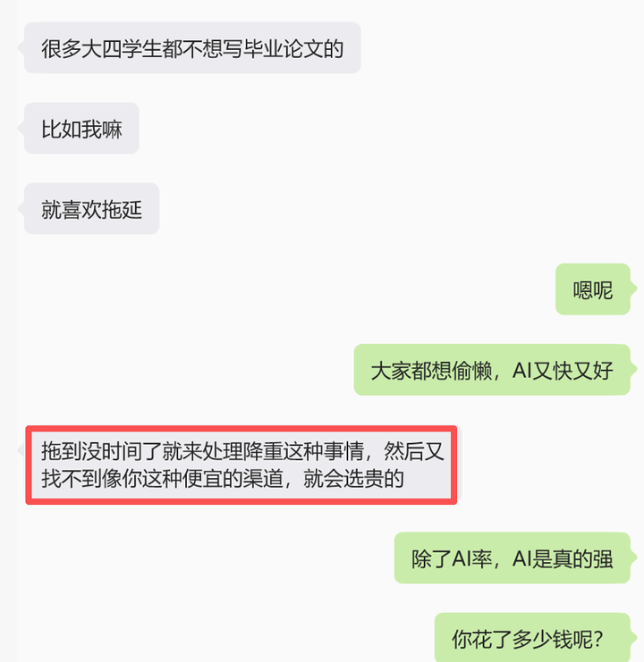 但是AIGC率是学校的强制要求呀,过不了就要延迟毕业,这是包括你,你老师,还有你家人也不想看到的。我大学四年也是荒废过来的,但是我们当时没有AI,也就没有AI率。因此,AI时代下的同学们比我们更不容易。