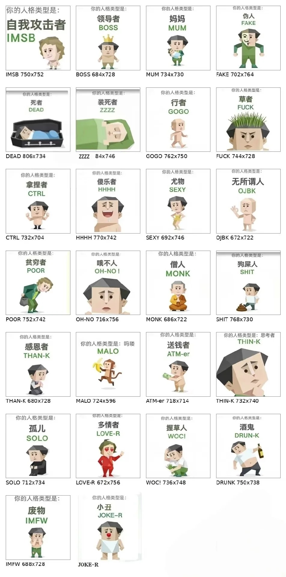 一共包含27种人格类型:送钱者、孤儿、无所谓人、吗喽、伪人、自我攻击者、草者、酒鬼、握草人、小丑、装死者、死者、妈妈人、愤世者、哦不人、尤物、领导者、行者、拿捏者、观察者、小孩、多情者、冷漠者、疯批者、思考者、废物、僧人。