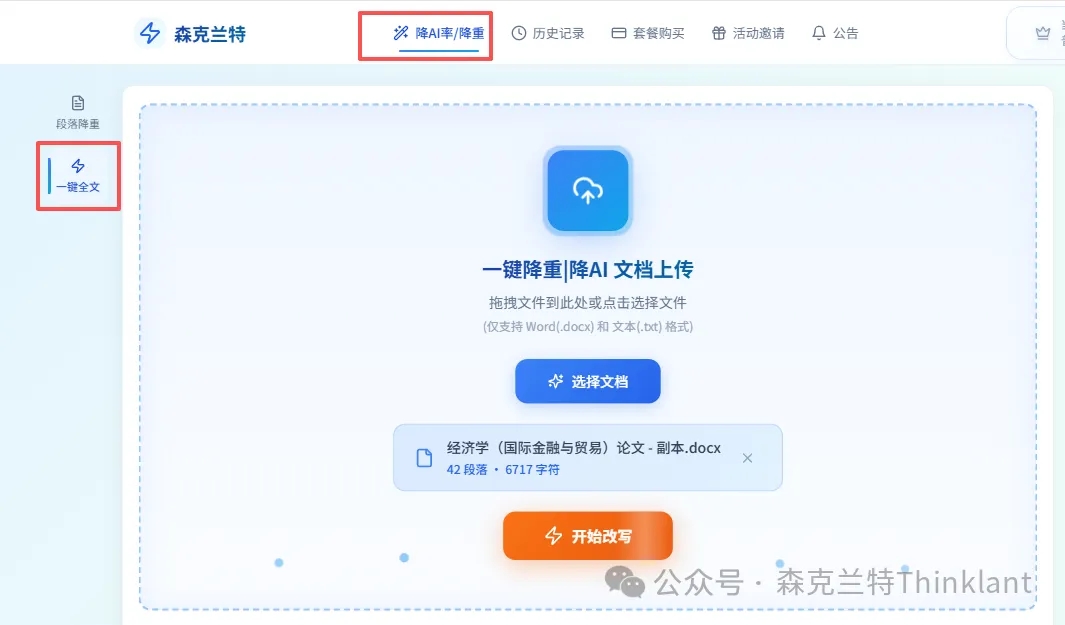 3、选择降AI率/降重,一键全文,上传你的文档,然后选择开始改写。很快的时间,就改写好了。