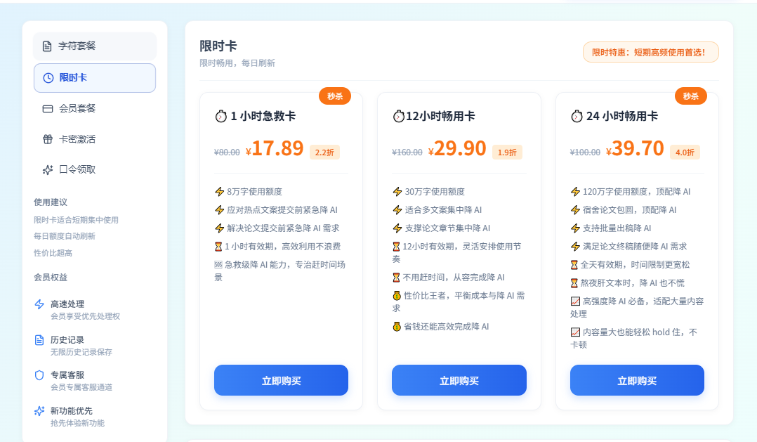 24小时内不限次数、120万字符使用额度。支持一键全文降AI,适合使用量大,比如AI长篇文章、AI学生文章、AI小说、AI剧本、AI自媒体长文章等。仅限本人使用,但正常切换设备/账号不超过3个。
