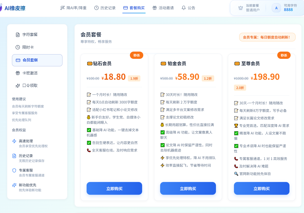 我们有三种形式的包月会员1、每天3000字符的包月会员(不推荐)2、每天20000字符的包月会员(少量使用推荐)3、每天80000字符的包月会员(大量使用还可以多开账号,推荐)